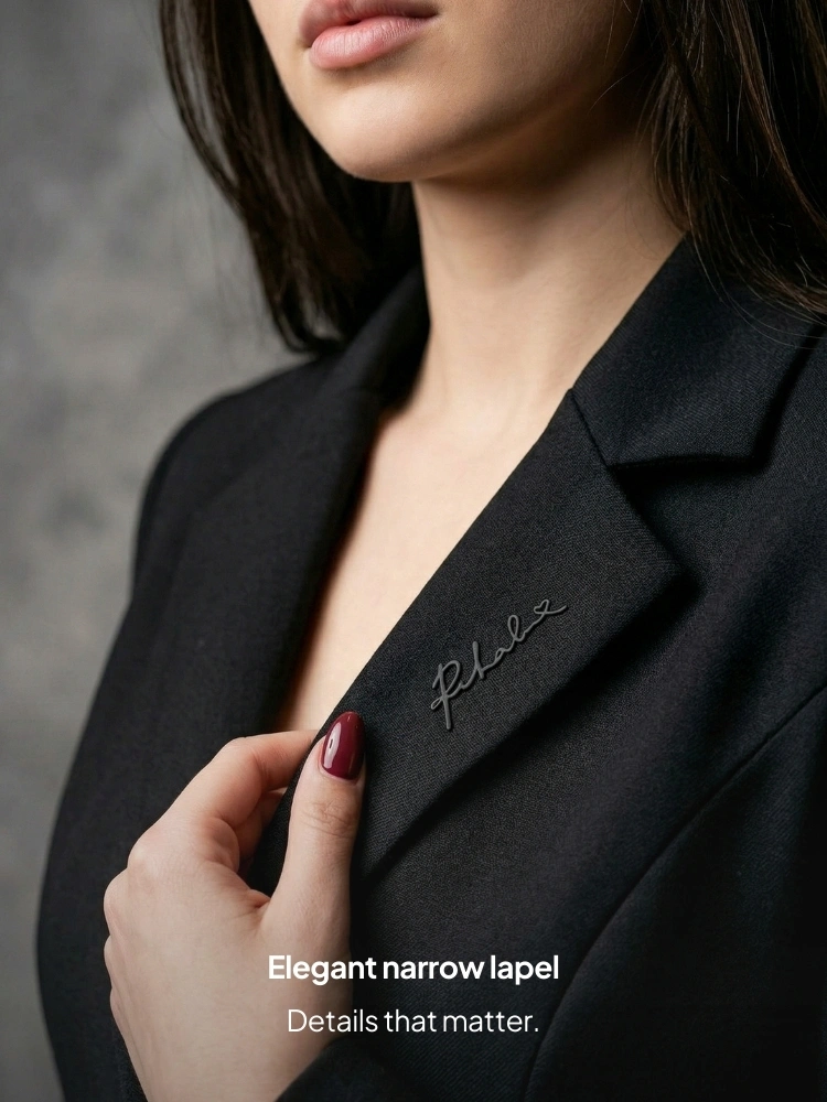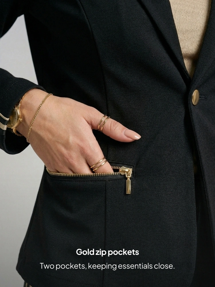 • Elegant lapel and single closure with gold metal button